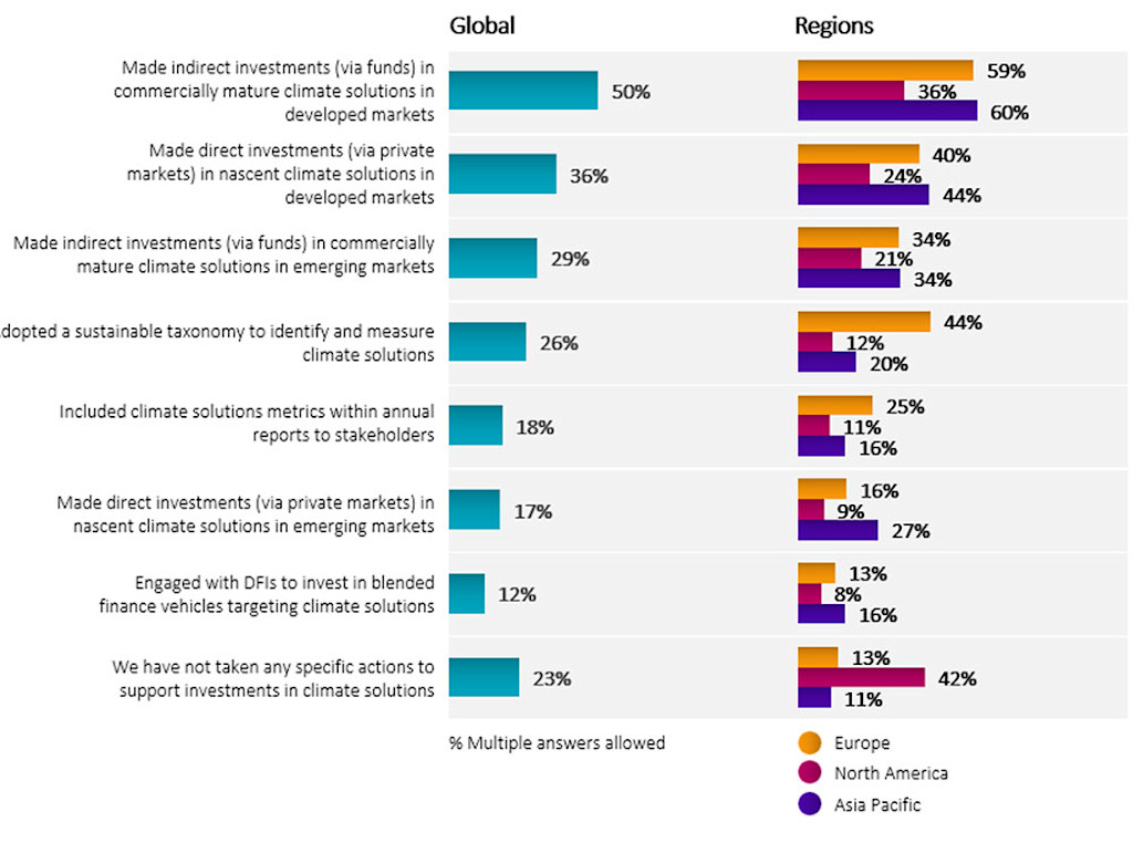 While almost half of investors see a clear pathway to equities or bonds targeting transition, much more of this is being focused on developed economies rather than emerging markets. The Global Climate Investing Survey also revealed that 50% of investors were investing through funds in commercially mature climate solutions in developed markets, while only 29% were pursuing the same thing in emerging markets.