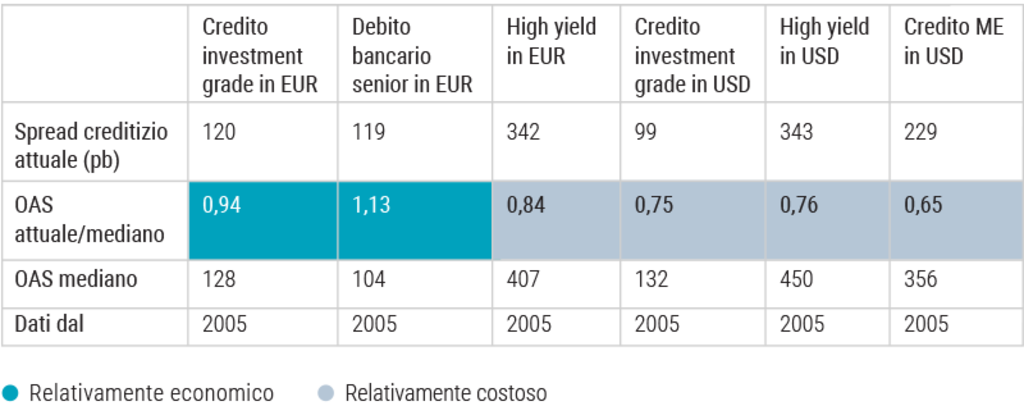 La tabella semplificata delle valutazioni riportata in basso mostra l’option-adjusted spread (OAS) di vari segmenti del mercato globale del credito, indicando quali sono sottovalutati e quali sopravvalutati.1Misura utilizzata nell’analisi del credito per confrontare il rendimento di un’obbligazione con il tasso di rendimento privo di rischio.