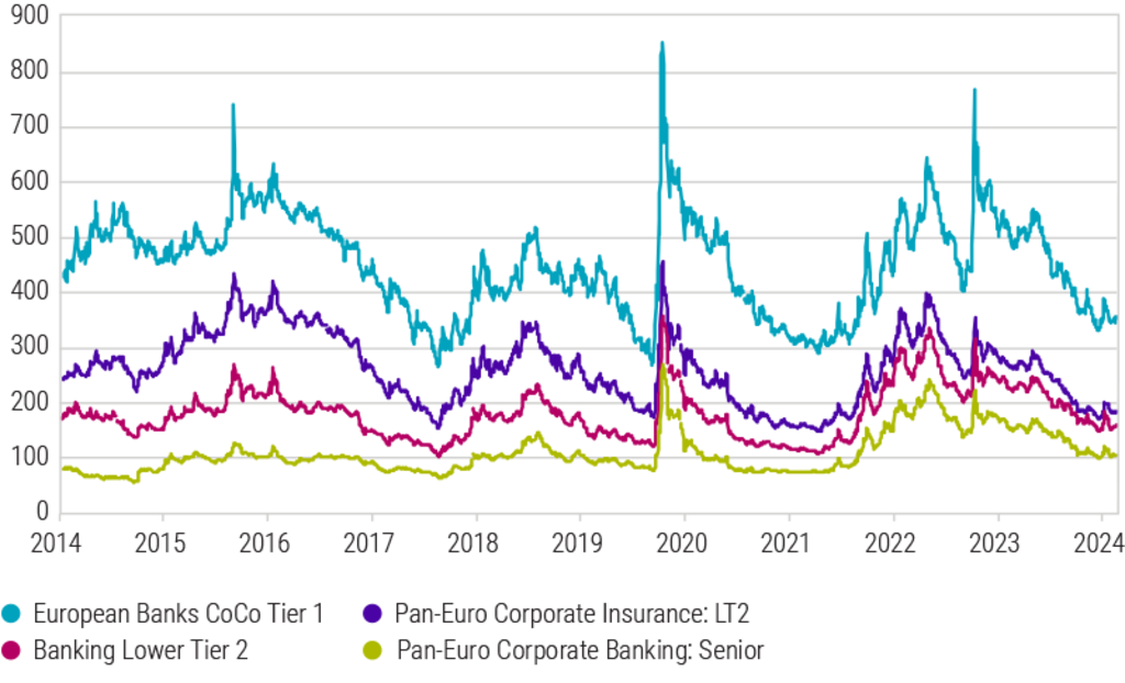 Quelle: Robeco, Bloomberg. Stand: 31. Juli 2024. Verwendete Indizes: Bloomberg European Bank AT CoCo Index. Bloomberg European Bank LT 2 Index. Bloomberg European Bank Senior Debt. Bloomberg European Insurance Debt Index.