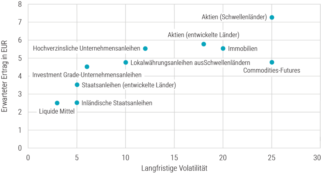 Erwartete Renditen der Assetklassen im Vergleich zur langfristigen Volatilität