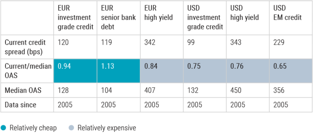 Our simplified valuation table below shows the option-adjusted spread (OAS) for various segments of the market, indicating which global credit market segments are undervalued and those that are overvalued.1 This is a measure used in credit analysis to compare the yield of a bond with the risk-free rate of return.