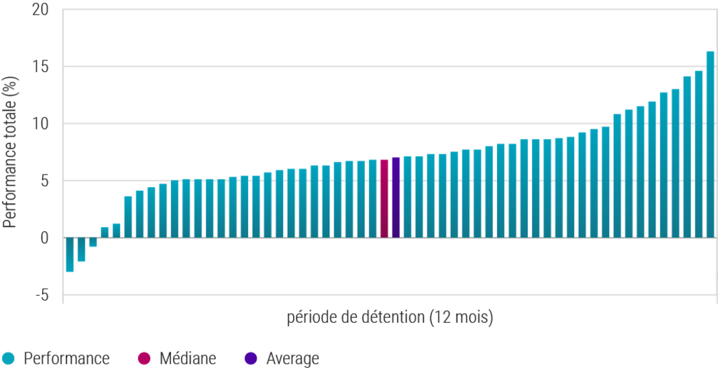 Pour évaluer le potentiel de performance totale des crédits Investment Grade dans l'environnement de taux actuel, nous avons analysé les périodes de douze mois des 22 dernières années qui ont débuté avec des niveaux de taux similaires. Nous avons ensuite calculé les performances totales au cours de ces périodes. La figure ci-dessous montre la distribution des performances totales des 56 périodes de douze mois de notre échantillon de recherche, chacune d'elles ayant débuté avec un taux compris entre 4 % et 5 %.