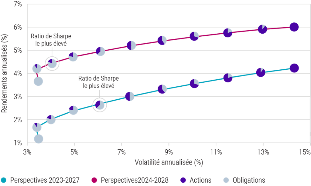 Frontières efficientes des obligations et des actions pour les perspectives 2023-2027 par rapport à 2024-2028