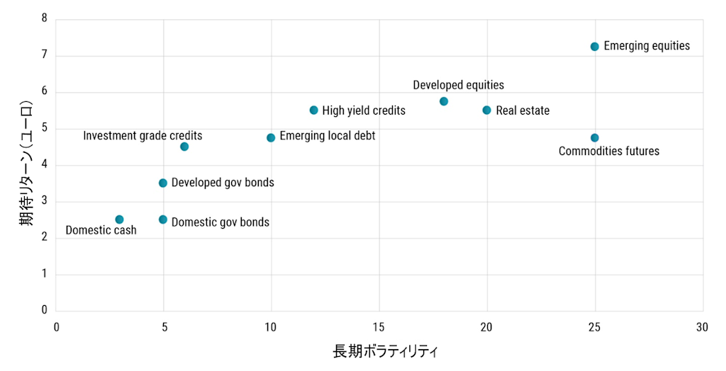 各種資産クラスの期待リターンと長期ボラティリティ