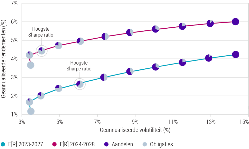 Efficient frontier van obligaties en aandelen voor Expected Returns 2023-27 vs. 2024-28
