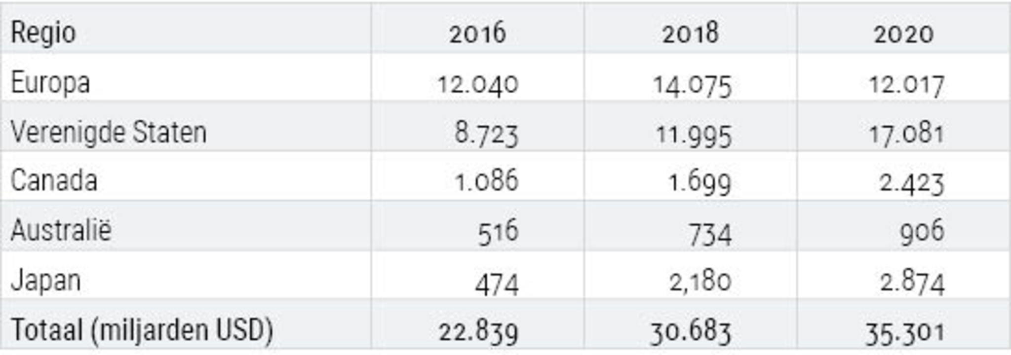 Figuur 2: De toename van wereldwijde duurzame beleggingen van 2016 tot 2020 in biljoen USD