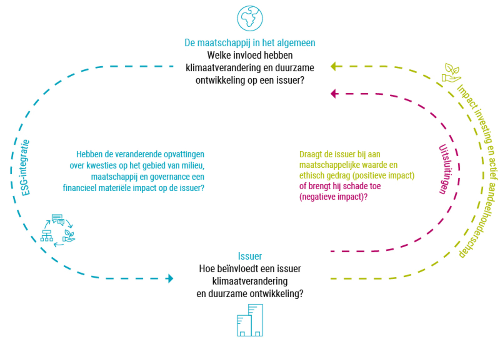 Bij duurzaam beleggen worden progressieve ESG-praktijken toegepast die de waarde kunnen verhogen. Daarnaast wordt het concept van dubbele materialiteit gehanteerd. Beleggers moeten niet alleen kijken naar de invloed van duurzame ontwikkeling op de bedrijfsmodellen van bedrijven en dus hun financiële waarde, maar ook naar het effect dat het bedrijf (of het land) heeft op de wereld.