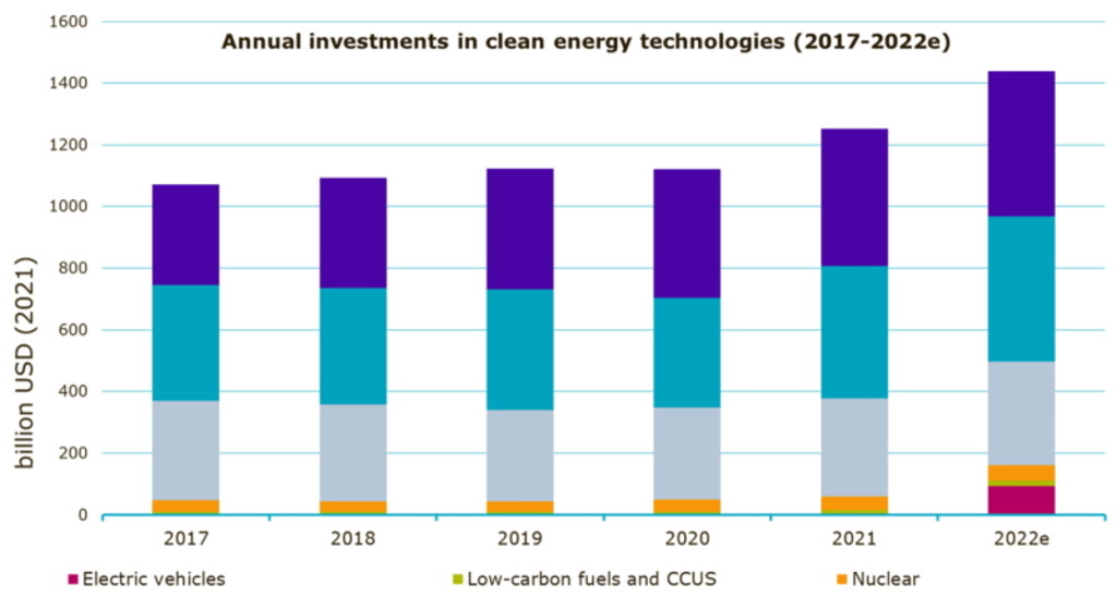 Die Investitionen in energieeffiziente Technologien wie elektrische Wärmepumpen sind beinahe so hoch wie die im Bereich erneuerbare Energien. N.B. Summe für 2022 geschätzt.