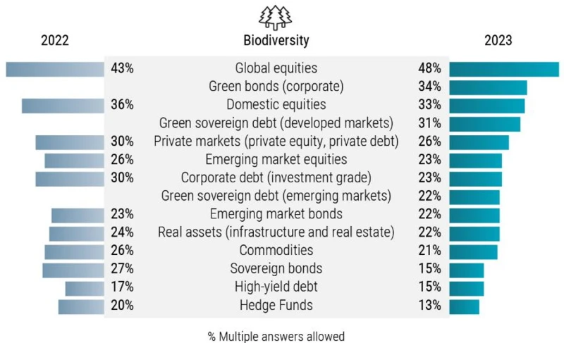 Globale und inländische Aktien sowie grüne Unternehmensanleihen sind die bevorzugten Anlageklassen für die Integration von Biodiversitätsaspekten in den nächsten ein bis zwei Jahren. Lediglich 25 % der befragten Anleger nutzen aktuell speziell auf Biodiversitätsziele ausgerichtete Anlageprodukte; doch die Nachfrage nach wirkungsorientiertem Investieren und thematischen Strategien hat im Vergleich zur Umfrage von 2022 sprunghaft zugenommen.