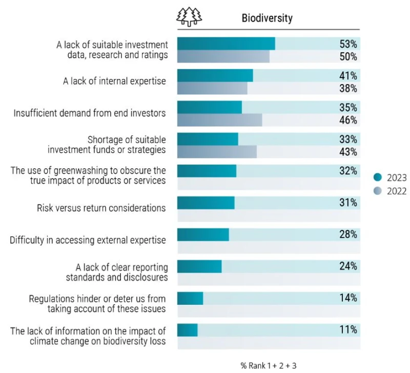 Was die Faktoren angeht, die einer stärkeren Berücksichtigung von Biodiversität in Portfolios entgegenwirken, so hat die Umfrage gezeigt, dass eindeutig ein Bedarf an besseren Daten, Analysen und Bewertungen besteht. Der Anteil der Anleger, die einen Mangel an Daten beklagen, hat sich von 50 % auf 53 % erhöht, während der Anteil derjenigen, die auf einen Mangel an internem Fachwissen hinweisen, von 38 % auf 41 % zugenommen hat.