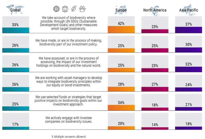Die Umfrage hat deutlich gemacht, dass es in den einzelnen Regionen der Welt unterschiedlich großes Interesse an diesem Thema und unterschiedliche Ansätze dafür gibt. Etwa 42 % der befragten europäischen Anleger gaben an, dass sie Biodiversität so weit möglich berücksichtigen und dabei Instrumente wie die UN-Ziele für nachhaltige Entwicklung (SDGs) nutzen, um ihre Vorgaben zu erreichen, verglichen mit 37 % der Anleger im asiatisch-pazifischen Raum, 23 % in Nordamerika und einem weltweiten Durchschnitt von 33 %.