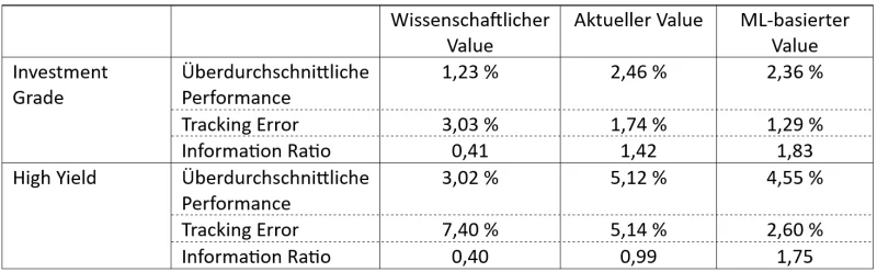 Die entscheidende Verbesserung des ML-basierten Ansatzes gegenüber dem aktuell verwendeten Value-Ansatz ist die Reduzierung des aktiven Risikos (Tracking Error). Der ML-basierte Value-Ansatz zeichnet sich dadurch aus, dass er Value-Fallen im risikoreicheren Segment des Marktes meidet, was zu weniger Exponiertheit gegenüber den risikoreichsten Anleihen führt. Im Investment-Grade-Bereich wird diese Reduzierung des aktiven Risikos bei im Vergleich zum derzeitigen Ansatz etwas geringerer Outperformance erreicht. Bei High-Yield-Anleihen ist die Outperformance zwar geringer. Der ML-basierte Ansatz reduziert aber das aktive Risiko erheblich, was zu einer deutlich besseren risikobereinigten Gesamtperformance der Strategie führt, wie die Information Ratio zeigt. Dies macht deutlich, dass mit dem ML-basierten Value-Faktor bei moderatem Risiko eine attraktive Outperformance erreicht werden kann.