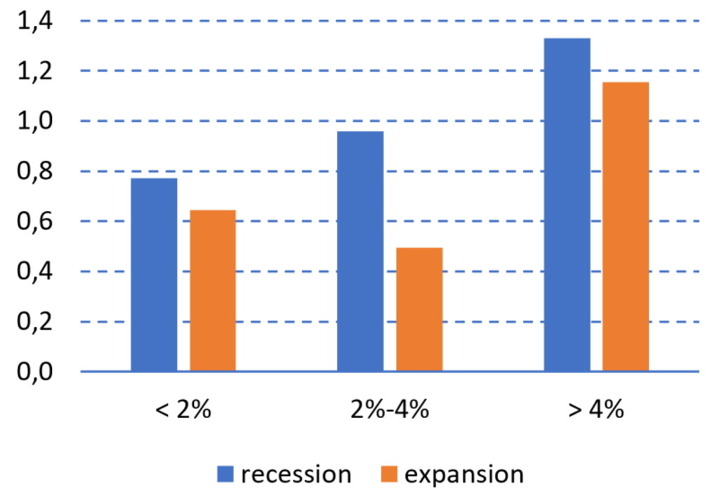 The blue bars denote the information ratio of the bond market predictability strategy in recession periods, the grey bars in periods of expansion, with the bars (from left to right) showing the results in periods with low, moderate and high inflation. The figure shows that the back-tested strategy worked in all environments. Bond market predictability is especially strong in periods of stagflation, where inflation is high in a recession.