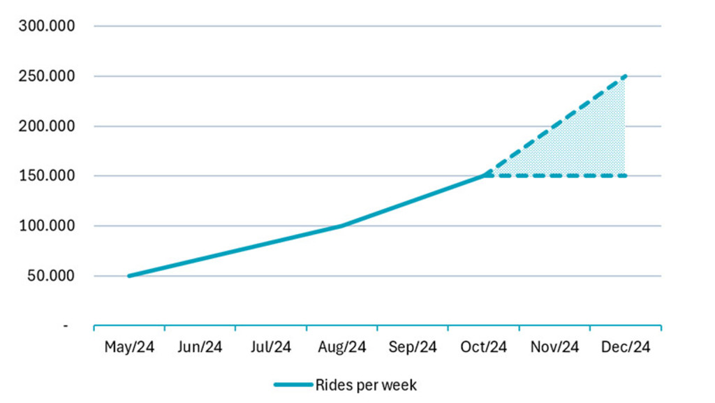 Fuente: Waymo, 2024. Desplazamientos semanales de pago mediante coches totalmente autónomos de Waymo en san Francisco, Los Ángeles y Phoenix. El área sombreada representa el rango de «más de 150.000» desplazamientos semanales, extrapolados a nuevas oportunidades de mercado en 2025.