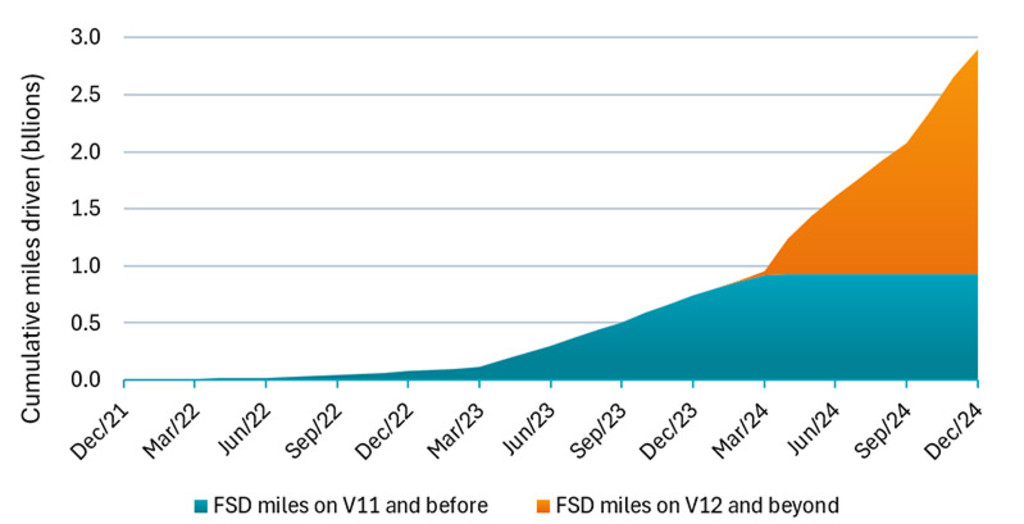Fuente: Tesla, 2024. «Full Self-Driving» (FSD, versión 12) es el sistema de conducción autónoma más avanzado de Tesla. Este ofrece autonomía avanzada de nivel 2 («supervisada») y está diseñado para ofrecer autonomía de nivel 3 y 4 («no supervisada»). Los modelos de IA en los que se basa se entrenan con datos recabados durante los miles de millones de millas recorridas por vehículos de Tesla y están diseñados para aplicarse a toda la flota.