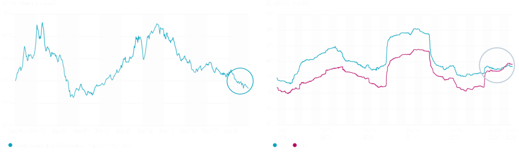 El gráfico de la izquierda muestra el diferencial de valoración del índice MSCI World respecto al índice MSCI Emerging Market. El diferencial de valoración se determina a partir de cuatro múltiplos bottom-up (precio/valor, precio/beneficios, precio/flujo de caja y precio/dividendo). Para cada múltiplo, la ratio de valoración del índice MSCI Emerging Markets se divide entre la misma ratio de valoración del índice MSCI World. El gráfico de la derecha muestra la desviación típica en cinco años consecutivos del índice MSCI Emerging Market y del índice MSCI World. Fuente: Robeco, MSCI, agosto de 2023.