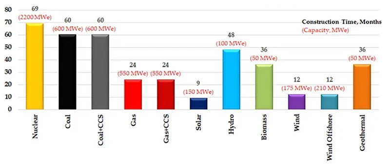 Figure 3 – Construction time needed for energy sources (in months, expected megawatts of power)