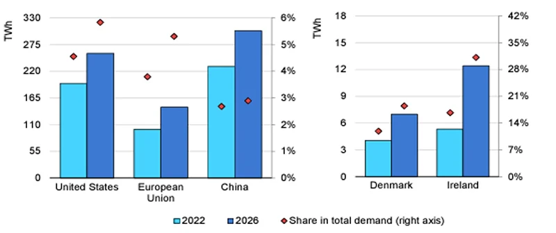 Source: IEA, 2023. Data center energy demands are consuming more grid resources globally.