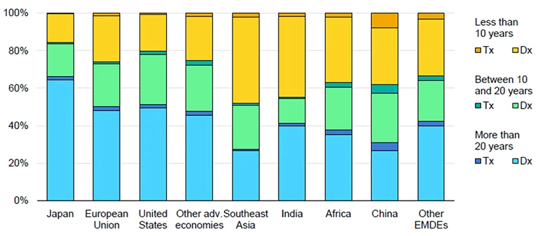 Source: IEA, October 2023. The graphic shows the age of different parts of the energy grid. Transmission infrastructure (Tx) carries power from generation plants. Distribution infrastructure (Dx) is the last mile to end users.