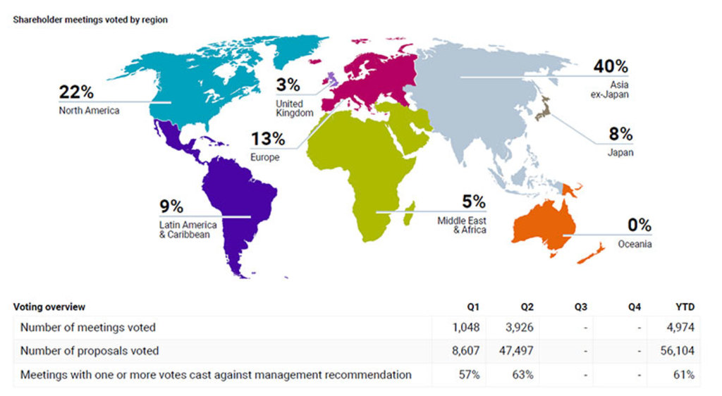 Le rapport annuel explique dans le détail la manière dont l’équipe Actionnariat actif a voté lors de près de 5 000 assemblées générales annuelles des actionnaires (AGA) sur un large éventail de thèmes environnementaux, sociaux et de gouvernance (ESG). Sur les 56 600 sujets à l’ordre du jour abordés, au moins un vote a été exprimé contre la direction dans 61 % des cas.