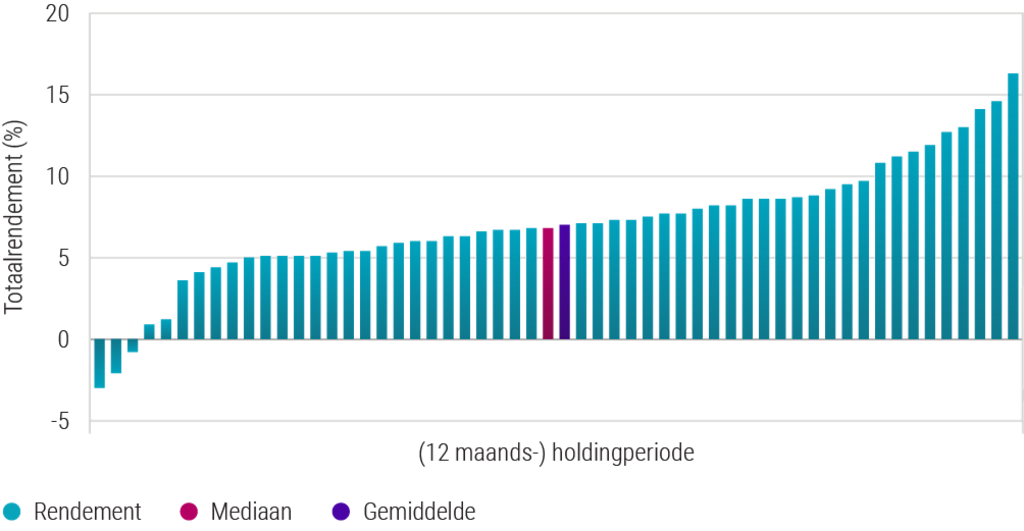 We zien duidelijk dat de kans op een positief totaalrendement bijzonder groot is. In slechts drie van de 56 periodes kwam het totaalrendement uit tussen -6% en 0%. Het laagste totaalrendement was -3,0%, terwijl het hoogste totaalrendement 16,3% was. Het gemiddelde rendement bedroeg 7,1%.
