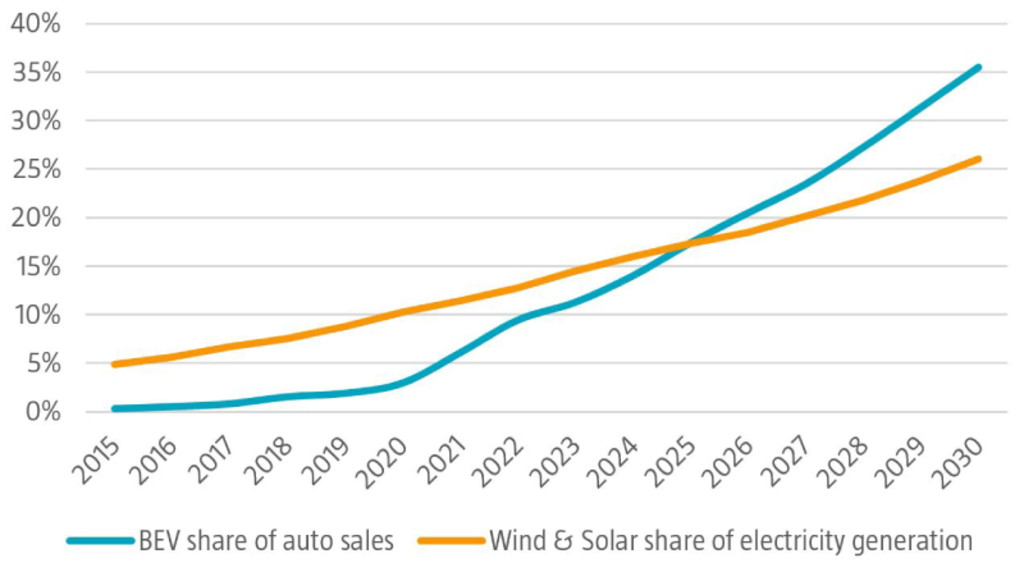 We zien vaak een kloof tussen de uitgesproken voorkeuren van consumenten en hun uitgaven, maar de groei van de verkoop van elektrische auto's en de installatie van zonnepanelen toont aan dat belangen en acties onder de juiste omstandigheden kunnen samenvallen. In de afgelopen vijf jaar liet de verkoop van elektrische personenvoertuigen (EV’s) een samengestelde jaarlijkse groei zien van 61%, terwijl de samengestelde jaarlijkse groei van de verkoop van benzinevoertuigen in die periode uitkwam op -5%. Opvallend genoeg is de verkoop van EV's, ondanks het aanhoudende tekort aan halfgeleiders, volgens een schatting van Bloomberg New Energy Finance (BNEF) in 2022 op jaarbasis met 66% gestegen naar 7,6 miljoen, wat goed is voor 9,4% van de wereldwijde markt. Met een samengestelde jaarlijkse groei van 15,3% is ook de productie van wind- en zonne-energie de afgelopen vijf jaar meer dan tien keer zo snel toegenomen als de totale elektriciteitsopwekking. BNEF schat dat het gecombineerde aandeel van deze twee hernieuwbare energiebronnen in 2022 is uitgekomen op 12,7% van de wereldwijde energiemix en dat dit aandeel in 2030 al is opgelopen naar een kwart van de markt.