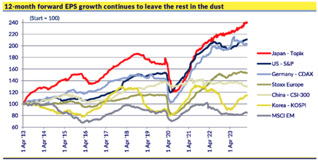Japan heeft de hoogste verwachte winstgroei per aandeel van alle grote markten. Bron: CLSA, Bloomberg, februari 2024.