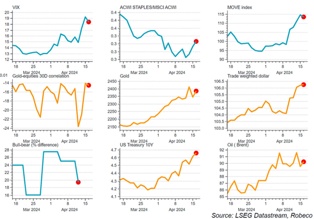 While the successful thwarting of the Iranian attack by Israel and its allies was followed by initial relief in financial markets, sentiment has grown more bearish since then, against a backdrop of stalling global disinflation and fading confidence by US Federal Reserve board members about their ability to cut policy rates sooner rather than later. Our risk dashboard shows volatility (both in equity and bond markets) has corrected sharply on prospect of higher-for-longer policy rates and Middle East turmoil.