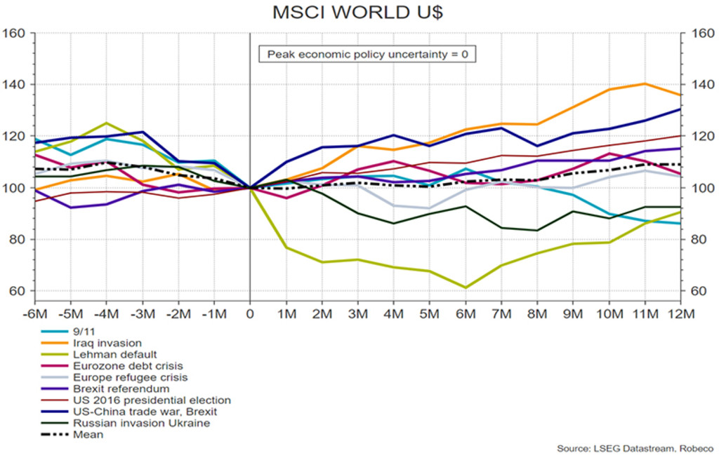 As investors, one should try to avoid becoming an ‘armchair general’. No one knows for sure whether the parties involved have the willpower to escape a self-defeating cycle of vengeance. Markets only can price in the level of uncertainty around macroeconomic outcomes, not the specific sequence of future geopolitical events that might trigger these macro shocks. Therefore, risky assets like equities typically tend to rally only once geopolitical uncertainty has peaked, something which can only be assessed in hindsight.