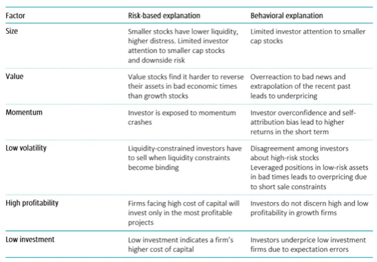 From a practical perspective, we think investors should stick to factors that have been well researched and documented and for which robust economic rationale - be it risk-based or behavioral – has been put forward to justify their persistence over time. The table below summarizes some of the most common explanations for six well-known equity factors.10