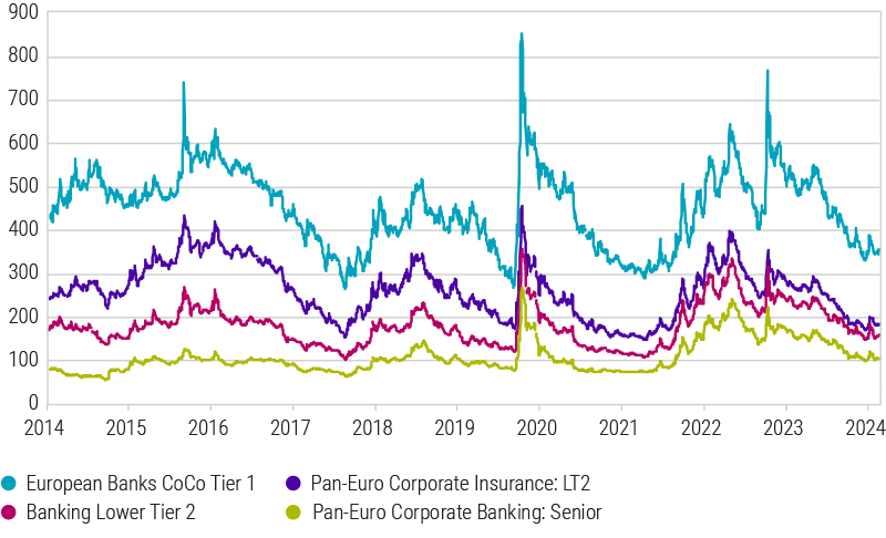 Quelle: Robeco, Bloomberg. Stand: 31. Juli 2024. Verwendete Indizes: Bloomberg European Bank AT CoCo Index. Bloomberg European Bank LT 2 Index. Bloomberg European Bank Senior Debt. Bloomberg European Insurance Debt Index.