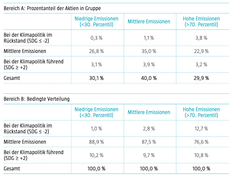 Anschließend ordneten wir die Aktien auf Basis ihrer CO2-Fußabdrücke und ihrer Scores in Bezug auf die klimarelevanten SDGs in 3x3 sich gegenseitig ausschließende Gruppen ein. Im Hinblick auf die CO2-Fußabdrücke gruppierten wir die Titel unter Verwendung der 30. und 70. Perzentile. Firmen mit einem Score in Bezug auf klimarelevante SDGs von -3 oder -2 wurden als im Rückstand befindlich klassifiziert. Unternehmen mit einem entsprechenden Score von +2 oder +3 wurden dagegen als in punkto Klimapolitik führend kategorisiert. Abschnitt A in Tabelle 1 zeigt den Prozentanteil der Aktien, die jeweils zu den neun einzelnen Gruppen zählten. Abschnitt B zeigt die bedingte Verteilung der CO2-Fußabdrücke.