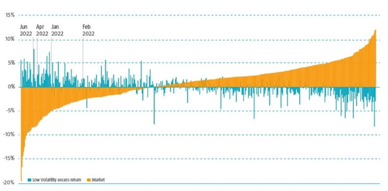 Source: Refinitiv, Robeco. The chart shows the monthly excess returns of the lowest volatility quintile portfolio versus the market, alongside the corresponding market returns. The months are then ordered from the lowest market returns to the highest. Volatility is measured as the past 156-week return volatility. The investment universe consists of MSCI World and MSCI Emerging Markets indices constituents. Before 2001, we use the FTSE World Developed Index for developed markets (going back to December 1985) and the largest 800 constituents of the S&P Emerging BMI at the semi-annual index rebalance for emerging markets (going back to December 1995). The portfolios are value-weighted and rebalanced monthly. The sample period is from January 1986 to June 2022.