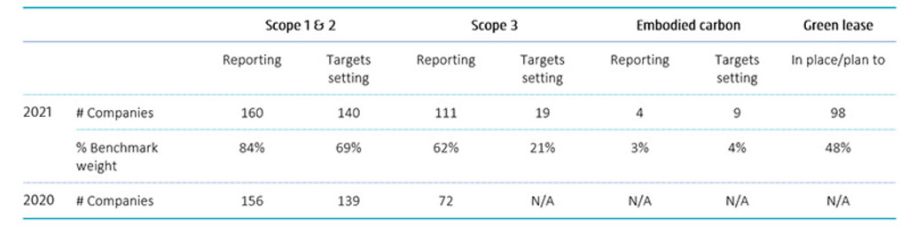 - Immobilienunternehmen haben die Offenlegung ihrer CO₂-Emissionen und die Festlegung von Zielvorgaben im Jahr 2021 verbessert, insbesondere was Scope-3-Emissionen angeht.