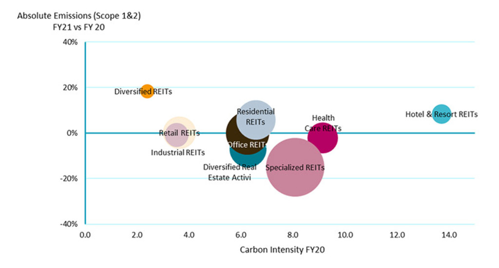 - Die 200 größten börsennotierten Immobilienunternehmen haben ihre CO₂-Emissionen im Jahr 2021 um 4,7 % gesenkt, wobei es zwischen den einzelnen Sektoren erhebliche Unterschiede gibt.