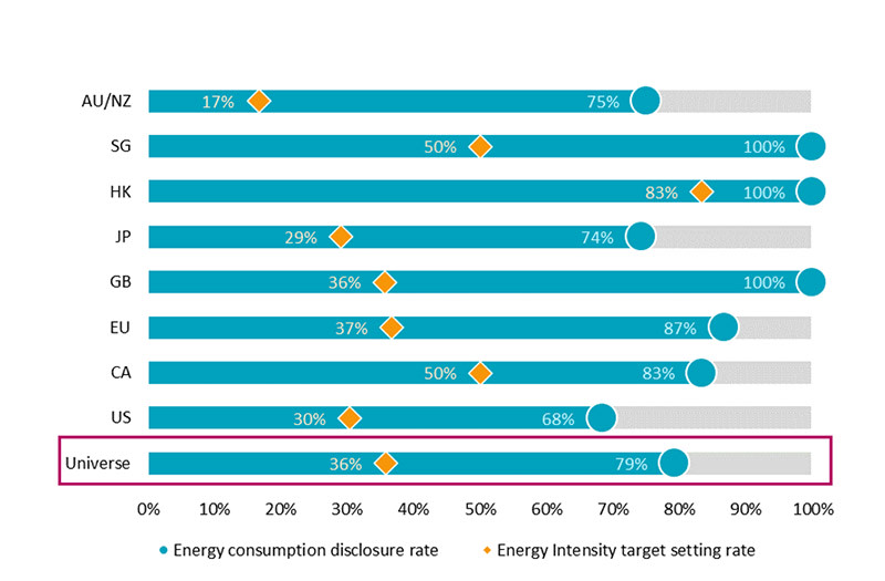 Wie aus Tabelle 2 hervorgeht, haben im Jahr 2021 157 Unternehmen in unserer Stichprobe, die in der Benchmark zusammen auf ein Gewicht von 82 % kommen, ihren Energieverbrauch angegeben. 71 Unternehmen mit einem Benchmark-Gewicht von zusammen 31 % haben sich Ziele für ihre Energieintensität gesetzt. Eine Auswertung der Daten (Abbildung 4) nach Ländern offenbart allerdings bemerkenswerte Unterschiede. Beispielsweise kommen Hongkong (100 % bzw. 83 %)6 und Singapur (100 % bzw. 50 %) bei der Offenlegung des Energieverbrauchs und der Festlegung von Zielen für die Energieintensität auf hohe Werte. Dagegen scheinen die Vereinigten Staaten (68 % bzw. 30 %) und Australien/Neuseeland (75 % bzw. 17 %) hinterherzuhinken.