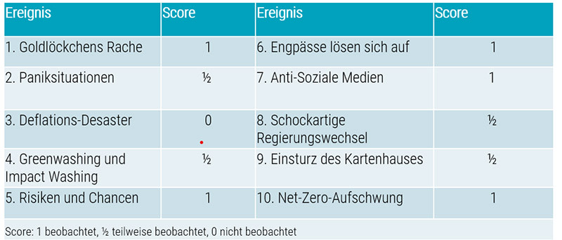 Wir führen darüber Buch. Sobald diese Risiken eingetreten sind, wird dies mit einem Punkt vermerkt. Wenn sie nicht eingetreten sind, erfolgt kein Scoring. Ein halber Punkt wird vergeben, wenn eine Entwicklung teilweise eingetreten ist. Die möglichen Szenarien, die wir zu Beginn des Jahres 2023 identifiziert hatten, haben sich bisher wie folgt entwickelt: