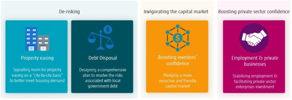 Der Ton in Bezug auf die Immobilienpolitik hat sich verändert und deutet auf eine entspanntere Haltung und weitere Lockerungsmaßnahmen hin. Das Politbüro hat die Aussage „Wohnraum ist zum Leben da und nicht für Spekulation“ fallen gelassen. Und in der Praxis erhalten die Kommunen mehr Flexibilität, um verbleibende Beschränkungen für den Wohnungskauf zu beseitigen und die Anforderungen für Anzahlungen für Zweithypotheken zu senken. Auch Banken werden Druck verspüren, Immobilienentwickler stärker mit Krediten zu unterstützen und Zinssenkungen für bestehende Immobiliendarlehen zu erwägen.