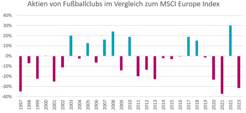 Abbildung 4: Rendite von Fußballaktien im Vergleich zum MSCI Europe Index in einzelnen Kalenderjahren