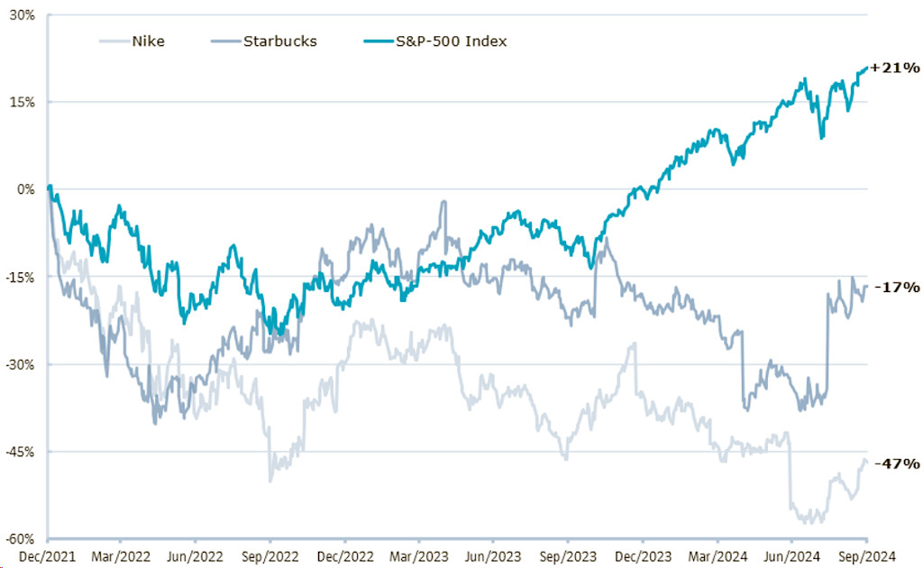 In den vergangenen 12 Monaten haben wir uns von unseren Positionen in bekannten globalen Verbrauchermarken wie Nike und Starbucks getrennt. Nike hat Mühe, sich gegen kleinere, wendigere Konkurrenz wie Hoka und On Holdings zu wehren, die einen raschen Aufstieg hinter sich, und Marktanteile auf dem Sportschuhmarkt erobert haben. Hoka, das sich im Besitz der börsennotierten Deckers Outdoor Corporation befindet, konnte sein Kerngeschäft in den USA durch innovatives Produktdesign, gezielte Marketingstrategien und die Ausweitung seines Publikums über die Sportgemeinde hinaus ausbauen, indem es Komfort hervorhebt. Das in der Schweiz ansässige Unternehmen On Holdings hat sich eine Nische geschaffen, indem es mit hochwertigen, innovativen Produkten sowohl im Leistungssport als auch bei wohlhabendem Publikum Anklang findet. On hat hochkarätige Werbepartnerschaften, unter anderem eine Kooperation mit Roger Federer, genutzt, um den Bekanntheitsgrad der Marke zu steigern.