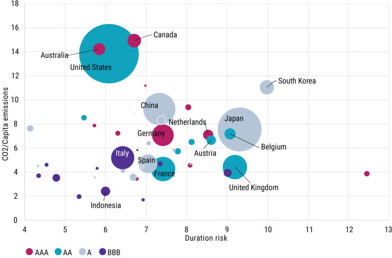 Dazu zeigt die folgende Abbildung verschiedene Länder, wobei jedes Land durch eine Blase dargestellt wird. Je weiter oben die Blase in der Abbildung steht, desto mehr CO2-Emissionen produziert das Land pro Kopf. Je weiter rechts sich die Blase befindet, desto empfindlicher reagieren die Anleihen des betreffenden Landes auf Zinsänderungen (Duration). Die Größe der einzelnen Blasen verdeutlicht, wie viele Anleihen des jeweiligen Landes im Bloomberg Global Treasury Index enthalten sind.
