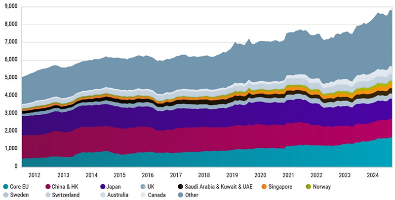 „Ein Rückgang der Handelsvolumina dürfte weniger Anreize bieten, Erlöse in Dollar zu halten, und die Umwandlung von im Ausland gehaltenen Dollar in lokale Assets wird wahrscheinlicher“, sagt Graham. „China hat seine Bestände an US-Staatsanleihen im Euroclear-System aufgestockt. Dadurch wird es einfacher, auf europäische Anleihen umzusteigen und eine Aufwertung des Renminbi gegenüber dem US-Dollar zu vermeiden.“