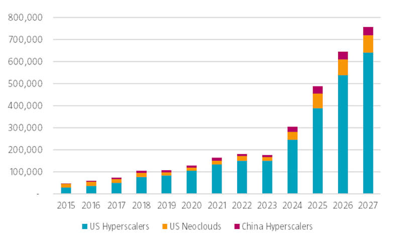 Jeder der drei führenden US-Anbieter im Cloud-Computing berichtete in seinen jüngsten Telefonkonferenzen, dass die Kundennachfrage nach KI-Anwendungen weiterhin die Kapazitäten übersteigt. Eine ähnliche Botschaft wurde von Neo-Cloud-Anbietern wie CoreWeave und Oracle in den USA sowie von führenden Cloud-Anbietern in China vermittelt. Trotz der Befürchtungen, dass sich die Investitionsausgaben verlangsamen könnten, stiegen die Pläne für KI-bezogene Investitionen. Die kombinierten Investitionsausgaben von US-Hyperscalern, Neo-Clouds und chinesischen Hyperscalern dürften 2025 im Vergleich zum Vorjahr um 60 % auf 488,5 Milliarden USD zunehmen. Diese revidierte Prognose für 2025 liegt um mehr als 67 Milliarden USD über den im August veröffentlichten Analystenschätzungen. Auch die Schätzungen für Cloud-Investitionen im Jahr 2026 haben sich erhöht – von 145 Milliarden USD auf 645 Milliarden USD (siehe Abbildung 3).