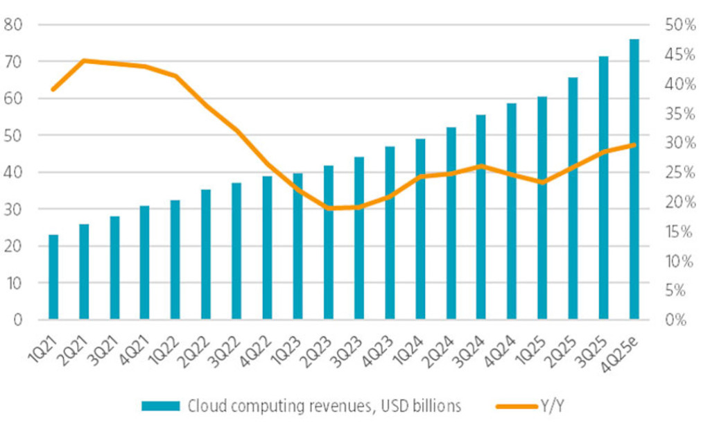 Wichtig ist, dass die steigenden Werte durch Gewinnwachstum unterstützt wurden. In den USA beispielsweise stiegen die Gewinne der Unternehmen im S&P 500 im 3. Quartal 2025 um schätzungsweise 13,1 % gegenüber dem Vorjahr, womit es das vierte Quartal mit zweistelligem Wachstum in Folge ist. Der Technologiesektor dürfte im 3. Quartal 2025 ein Gewinnwachstum von 27,1 % ausweisen, was deutlich über der Wachstumsrate von 20,9 % liegt, die Analysten zu Beginn der Berichtssaison vorausgesagt hatten. Im KI-Ökosystem meldeten die drei größten Plattformen für Cloud-Computing Amazon, Google und Microsoft gemeinsam ein beschleunigtes Wachstum des Segments von 28,5 % gegenüber dem Vorjahr, 300 Basispunkte mehr als im vorangegangenen Quartal. Nach Konsensschätzungen werden diese sogenannten Hyperscaler in diesem Jahr einen Umsatz von 273 Milliarden USD mit Cloud-Computing erwirtschaften – das entspricht fast einer Vervierfachung in den letzten fünf Jahren (siehe Abbildung 2).