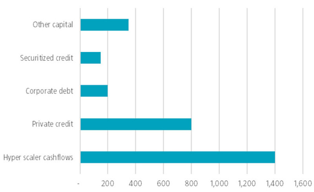Die Geschwindigkeit, mit der sich der KI-Markt entwickelt hat, sowie der Markteintritt und die relative Attraktivität der Fremdfinanzierung haben allerdings eine Welle der Kreditausgabe ausgelöst. Gemäß Daten von Bloomberg haben US-Unternehmen in diesem Jahr Anleihen im Wert von mehr als 200 Milliarden USD begeben, zu einem Großteil zur Finanzierung von KI-Infrastrukturprojekten. Morgan Stanley schätzt, dass über die Hälfte der zwischen 2025 und 2028 erwarteten KI-Investitionen in Höhe von 2,9 Billionen USD durch Anleihen und Kredite finanziert werden (siehe Abbildung 4).