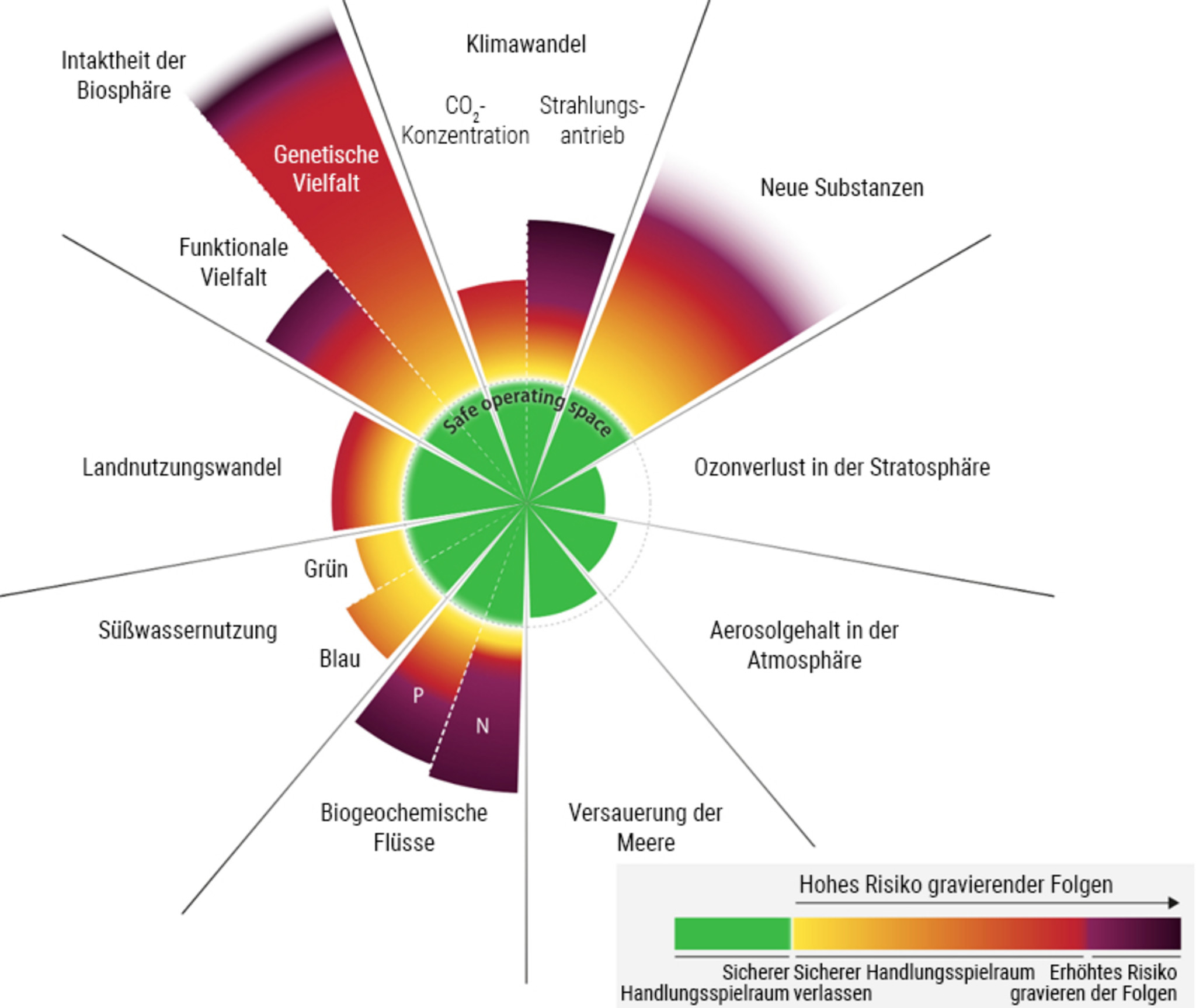 Nutzung von Land und Meeren: Dies ist auf die Abholzung der Wälder und die Ausweitung der Landwirtschaft an Land sowie die Überfischung der Meere zurückzuführen, welche den steigenden Bedarf der wachsenden Weltbevölkerung widerspiegeln. Rund 420 Millionen Hektar Wald – eine Fläche halb so groß wie die Vereinigten Staaten – und 86 % der Feuchtgebiete sind seit 1990 verlorengegangen. Gleichzeitig waren 23 % der Flächen weltweit von Degradation betroffen. Rund 30 % der Fischbestände sind durch Überfischung gefährdet
