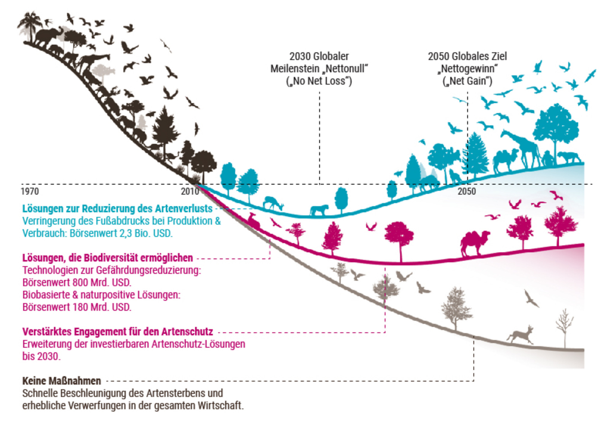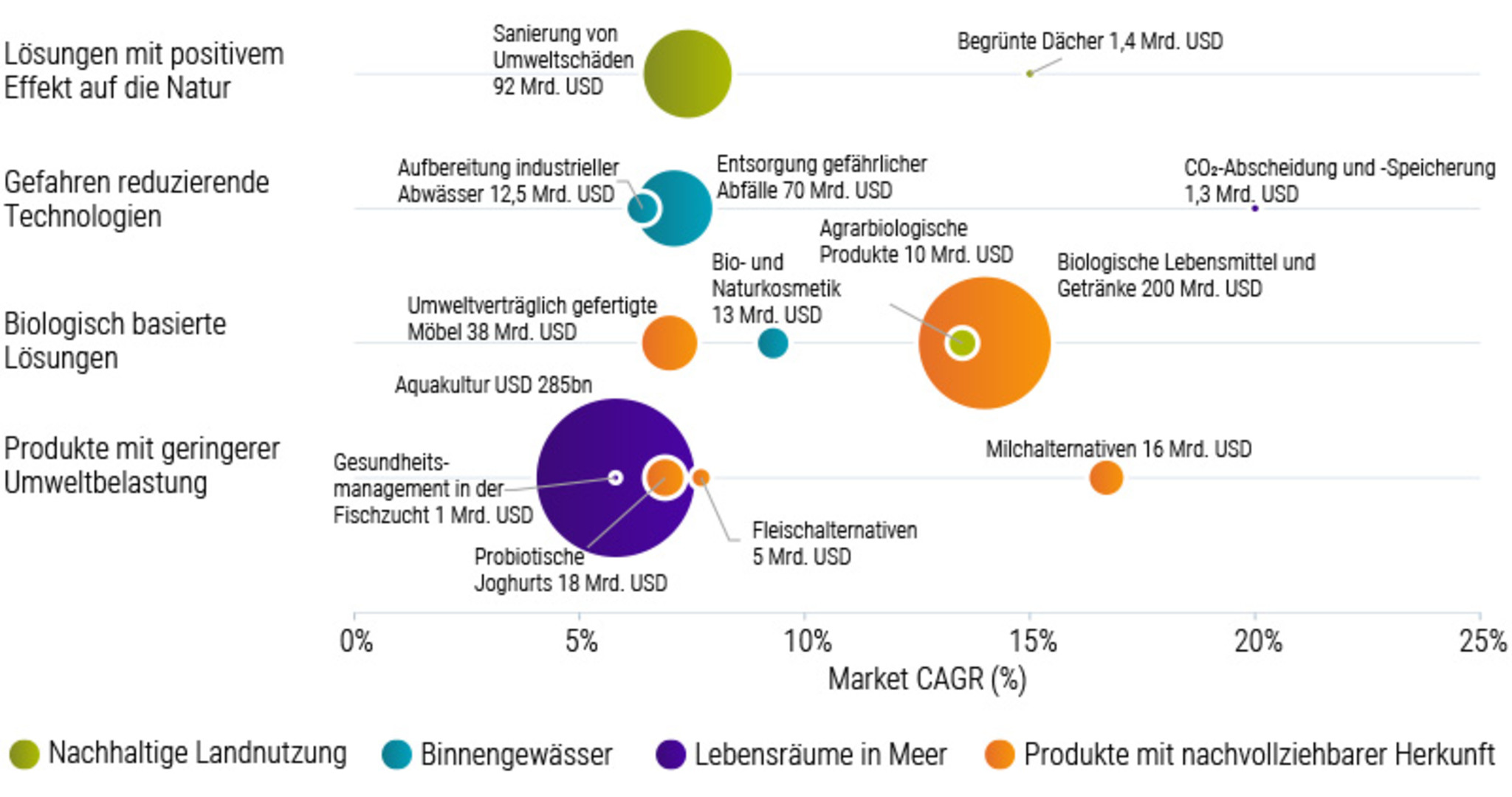 Die zweite Chance liegt in den verfügbaren Lösungen. Technologien zur Verringerung von Gefahren, z.B. die Abwasseraufbereitung, repräsentieren einen Wert von rund 800 Milliarden US-Dollar. Darüber hinaus eröffnen biopositive Lösungen wie der organische Pflanzenschutz oder die Bodensanierung ein Investitionspotenzial von weiteren 180 Mrd. Dollar. Wie im nächsten Kapitel erörtert, werden solche Risiken und Chancen für Investoren immer relevanter und bedeutender.