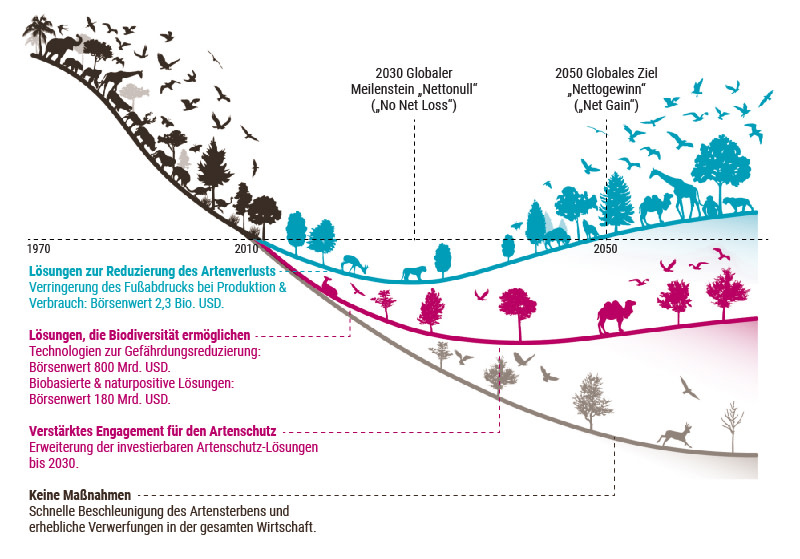 Verstärkte Naturschutzbemühungen werden jedoch nicht ausreichen, um einen Nettoverlust an Biodiversität zu verhindern. Man muss die Art und Weise, wie Waren produziert und konsumiert werden, entscheidend verändern. Wir müssen es der Natur ermöglichen, unsere Anforderungen an sie zu erfüllen, damit sie weiterhin alle von uns benötigten Dienste und Leistungen erbringen kann. Wir sind auf die Natur angewiesen, um eine bewohnbare und intakte Erde zu haben: Ohne sie können wir keine gesunde Gesellschaft oder Wirtschaft haben. Es gibt keinen „Planeten B“.