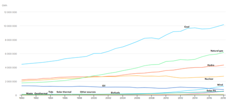 Energy generation by source: coal remains the world leader, while hydro is third.