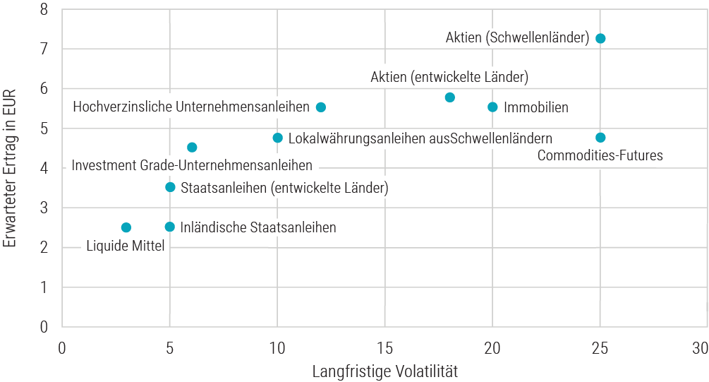 Erwartete Renditen der Assetklassen im Vergleich zur langfristigen Volatilität